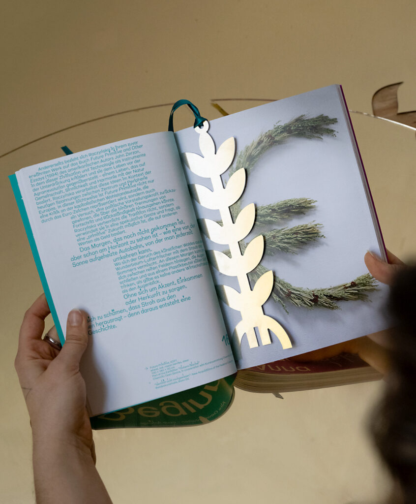 An integral element of the publication is a bookmark Edition (50 pieces) designed by me, made of 0.5 mm aluminium sheet – an object that moves between function and meaning, referring to my interest in semiotics, pictograms, symbols, and the relationships between organic, industrial, digital, and material elements.